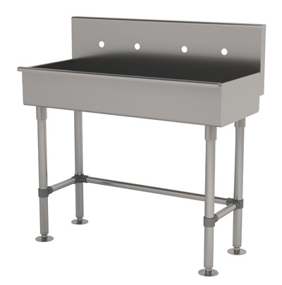 Description: Multiwash Hand Sink, with stainless steel legs and flanged feet, 40"W x 19-1/2"D x 42-1/2"H (overall), 16" front-to-back x 8" deep (bowl size), 8-1/2"H backsplash, punched with (2) sets of faucet holes 8" OC, includes 3-1/2" rear basket drain, 16 gauge 304 stainless steel construction
