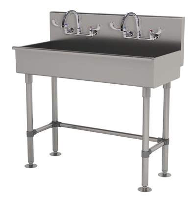 Description: Multiwash Hand Sink, with stainless steel legs and flanged feet, includes (2) faucets with wrist blades, 48"W x 19-1/2"D x 42-1/2"H (overall), 16" front-to-back x 5" deep (bowl size), 8-1/2"H backsplash, punched with (2) sets of faucet holes 8" OC, includes 3-1/2" rear basket drain, 16 gauge 304 stainless steel construction, ADA compliant