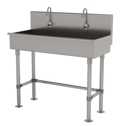 Description: Multiwash Hand Sinkwith (2) electronic faucets, 48"W x 19-1/2"D x 42-1/2"H (overall), 16" front-to-back x 8" deep (bowl size), 8-1/2"H backsplash, punched with (2) single faucet holes, gooseneck spouts, includes stainless steel legs & flanged feet, pedal bracket support, includes 3-1/2" rear basket drain, 16 gauge 304 stainless steel construction