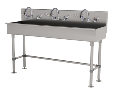 Description: Multiwash Hand Sink, with stainless steel legs and flanged feet, includes (3) faucets, 60"W x 19-1/2"D x 42-1/2"H (overall), 16" front-to-back x 8" deep (bowl size), 8-1/2"H backsplash, punched with (3) sets of faucet holes 8" OC, 3-1/2" rear basket drain, 16 gauge 304 stainless steel construction
