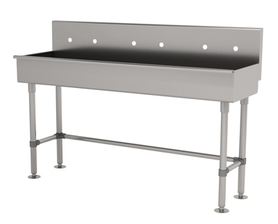 Description: Multiwash Hand Sink, with stainless steel legs and flanged feet, 60"W x 19-1/2"D x 42-1/2"H (overall), 16" front-to-back x 8" deep (bowl size), 8-1/2"H backsplash, punched with (3) sets of faucet holes 8" OC, 3-1/2" rear basket drain, 16 gauge 304 stainless steel construction