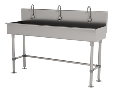 Description: Multiwash Hand Sink, with stainless steel legs and flanged feet, with (3) electronic faucets, 60"W x 19-1/2"D x 42-1/2"H (overall), 16" front-to-back x 8" deep (bowl size), 8-1/2"H backsplash, punched with (3) single faucet holes, includes 3-1/2" rear basket drain, 16 gauge 304 stainless steel construction