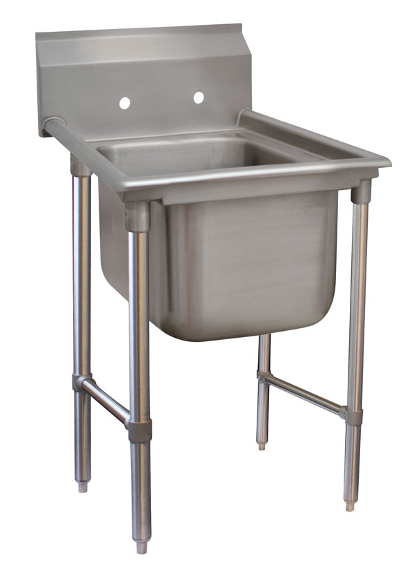 Description: Service Sink, 1-compartment, 25"W x 23"D x 34"H O.A., 20"W x 16"D front-to-back x 8" deep sink bowl, deep drawn sink bowl, 8"H backsplash, 304 stainless steel construction, 8" O.C. faucet holes, includes: 3-1/2" basket drain, 18/430 stainless steel legs & crossrails with stainless steel adjustable bullet feet