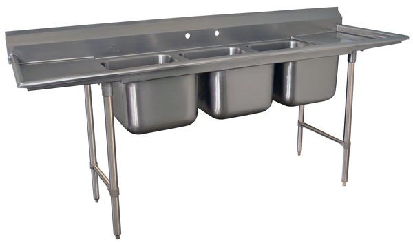 Description: Regaline Sink, 3-compartment, with right-hand drainboard, 20" front-to-back x 16"W sink compartments, 12" deep, with 8"H backsplash, stainless steel open frame base, side crossrails, 36" drainboard, 1" adjustable bullet feet, 18 gauge 304 stainless steel, overall 28" F/B x 96" L/R, NSF
