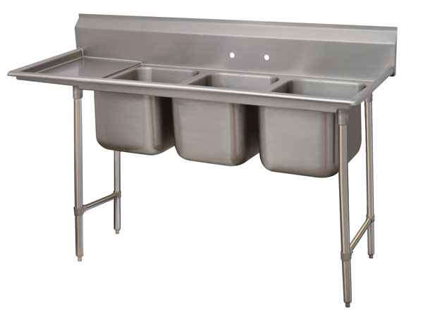 Description: Regaline Sink, 3-compartment, with left-hand drainboard, 20" front-to-back x 16"W sink compartments, 12" deep, with 8"H backsplash, stainless steel open frame base, side crossrails, 36" drainboard, 1" adjustable bullet feet, 18 gauge 304 stainless steel, overall 28" F/B x 96" L/R, NSF