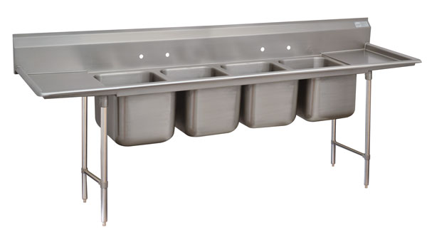 Description: Regaline Sink, 4-compartment, with left & right-hand drainboards, 20" front-to-back x 16"W sink compartments, 12" deep, with 8"H backsplash, stainless steel open frame base, side crossrails, 18" drainboards, 1" adjustable bullet feet, 18 gauge 304 stainless steel, overall 28" F/B x 110" L/R, NSF (requires 2 faucets)