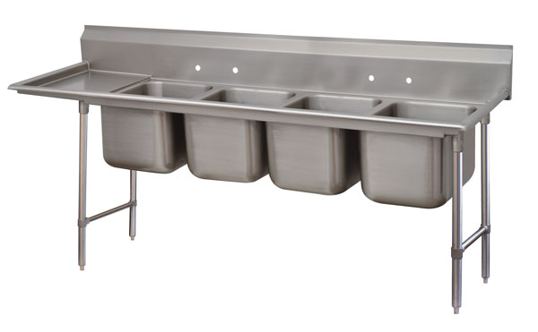 Description: Regaline Sink, 4-compartment, with left-hand drainboard, 20" front-to-back x 16"W sink compartments, 12" deep, with 8"H backsplash, stainless steel open frame base, side crossrails, 24" drainboard, 1" adjustable feet, 18 gauge 304 stainless steel, overall 28" F/B x 102" L/R NSF (requires 2 faucets)