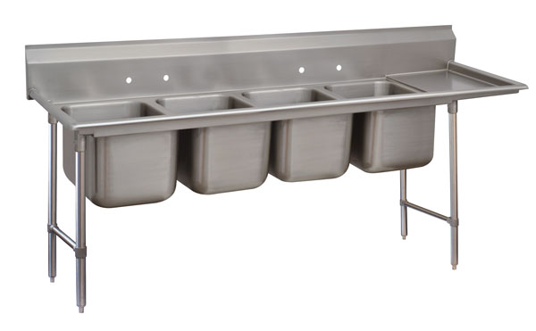 Description: Regaline Sink, 4-compartment, with right-hand drainboard, 20" front-to-back x 16"W sink compartments, 12" deep, with 8"H backsplash, stainless steel open frame base, side crossrails, 18" drainboard, 1" adjustable feet, 18 gauge 304 stainless steel, overall 28" F/B x 96" L/R NSF (requires 2 faucets)