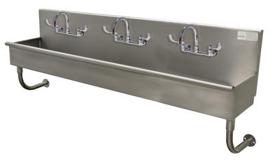 Description: Multiwash Hand Sink, wall mounted, includes (3) faucets with wrist blades, 60"W x 19-1/2"D x 25-1/2"H (overall), 16" front-to-back x 5" deep (bowl size), 8-1/2"H backsplash, punched with (3) sets of faucet holes 8" OC, includes 3-1/2" rear basket drain, 16 gauge 304 stainless steel construction, tubular stainless steel wall supports, ADA compliant