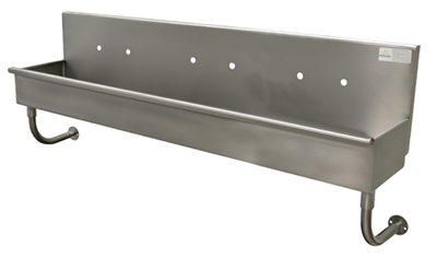 Description: Multiwash Hand Sink, wall mounted, with knee valve, 48"W x 19-1/2"D x 28-1/2"H (overall), 16" front-to-back x 8" deep (bowl size), 8-1/2"H backsplash, punched with (2) single faucet holes, gooseneck spouts, includes basket drain, 16 gauge 304 stainless steel construction, tubular stainless steel wall supports