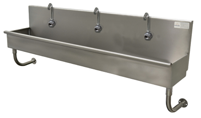 Description: Multiwash Hand Sink, wall mounted, with (3) electronic faucets, 72"W x 19-1/2"D x 28-1/2"H (overall), 16" front-to-back x 8" deep (bowl size), 8-1/2"H backsplash, punched with (3) single faucet holes, includes 3-1/2" rear basket drain, 16 gauge 304 stainless steel construction, tubular stainless steel wall supports