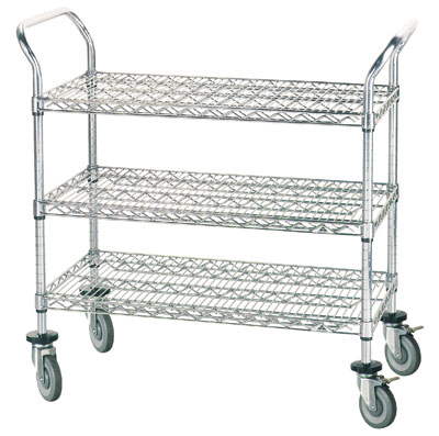 Description: Special Value Wire Utility Cart, heavy duty, (3) shelves, shelf size approximately 36"W x 24"D, 38"H, chrome plated, (4) swivel rubber casters with donut bumpers (2 braked), NSF