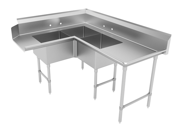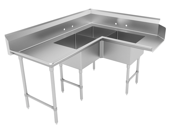 Description: Corner Dishtable with 3-compartment Sink, 71”W, (3) 20" x 20" x 12" bowls, 16 gauge 304 stainless steel top, stainless steel legs & front-to-back crossrails, attaches to left of dish machine operator, stainless steel bullet feet, 24" drainboard, bowls are located 12" from machine, NSF (must verify machine to make sure the control box does not interfere)
