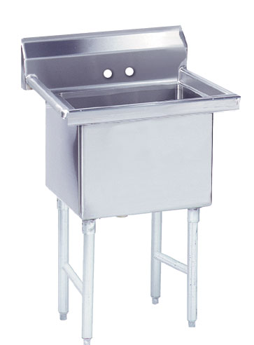 Description: Fabricated Sink, 1-compartment, no drainboards, bowl size 18" x 18" x 14" deep, 16 gauge 304 stainless steel, tile edge splash, rolled edge, 8" OC faucet holes, stainless steel legs with adjustable side cross-bracing, 1" adjustable stainless steel bullet feet, overall 24" F/B x 23" L/R, NSF