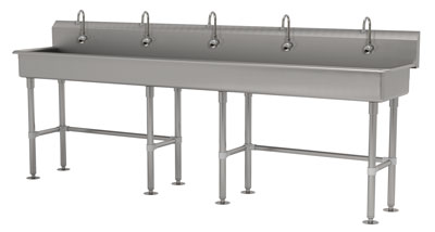 Description: Multiwash Hand Sink, splash mount faucet provision, with stainless steel legs and flanged feet, with (5) electronic faucets, 100"W x 19-1/2"D x 42-1/2"H (overall), 16" front-to-back x 8" deep (bowl size), 8-1/2"H backsplash, punched with (5) single faucet holes, includes 3-1/2" rear basket drain, 16 gauge 304 stainless steel construction, NSF