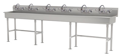 Description: Multiwash Hand Sink, splash mount faucet provision, with stainless steel legs and flanged feet, includes (6) faucets with wrist blades, 120"W x 19-1/2"D x 42-1/2"H (overall), 16" front-to-back x 5" deep (bowl size), 8-1/2"H backsplash, punched with (6) sets of faucet holes 8" OC, includes 3-1/2" rear basket drain, 16 gauge 304 stainless steel construction, NSF, ADA compliant