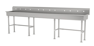 Description: Multiwash Hand Sink, splash mount faucet provision, with stainless steel legs and flanged feet, includes (5) faucets, 100"W x 19-1/2"D x42-1/2"H (overall), 16" front-to-back x 8" deep (bowl size), 8-1/2"H backsplash, punched with (5) sets of faucet holes 8" OC, includes 3-1/2" rear basket drain, 16 gauge 304 stainless steel construction, NSF