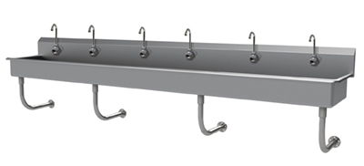 Description: Multiwash Hand Sink, splash mount faucet provision, wall mounted, with (6) electronic faucets, 120"W x 19-1/2"D x 29-1/2"H (overall), 16" front-to-back x 8" deep (bowl size), 8-1/2"H backsplash, punched with (6) single faucet holes, includes 3-1/2" rear basket drain, 16 gauge 304 stainless steel construction, tubular stainless steel wall supports, NSF