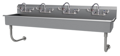 Description: Multiwash Hand Sink, splash mount faucet provision, wall mounted, includes (4) faucets with wrist blades, 96"W x 19-1/2"D x 25-1/2"H (overall), 16" front-to-back x 5" deep (bowl size), 8-1/2"H backsplash, punched with (4) sets of faucet holes 8" OC, includes 3-1/2" rear basket drain, 16 gauge 304 stainless steel construction, tubular stainless steel wall supports, NSF, ADA compliant