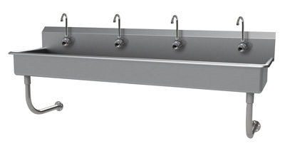 Description: Multiwash Hand Sink, splash mount faucet provision, wall mounted, with (4) electronic faucets, 96"W x 19-1/2"D x 29-1/2"H (overall), 16" front-to-back x 8" deep (bowl size), 8-1/2"H backsplash, punched with (4) single faucet holes, includes 3-1/2" rear basket drain, 16 gauge 304 stainless steel construction, tubular stainless steel wall supports, NSF