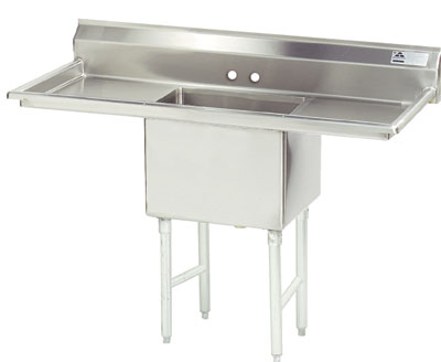 Description: Fabricated Sink, 1-compartment, 24" right drainboard, bowl size 18" x 24" x 14" deep, 14 gauge 304 stainless steel, tile edge splash, rolled edge, 8" OC faucet holes, stainless steel legs with adjustable side cross-bracing, 1" adjustable stainless steel bullet feet, overall 29-1/2" F/B x 44-1/2" L/R, NSF