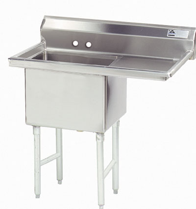 Description: Fabricated Sink, 1-compartment, 18" right drainboard, bowl size 24" x 24" x 14" deep, 14 gauge 304 stainless steel, tile edge splash, rolled edge, 8" OC faucet holes, stainless steel legs with adjustable side cross-bracing, 1" adjustable stainless steel bullet feet, overall 29-1/2" F/B x 44-1/2" L/R, NSF