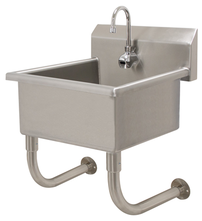 Description: Service Sink, splash mount faucet provision, wall mounted, with electronic faucet, 24"W x 18"D x 12" deep bowl, 14 ga stainless steel 8-1/2"H backsplash, single faucet hole, includes 3-1/2" rear basket drain, stainless steel tubular wall supports, NSF