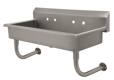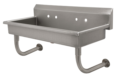 Description: Multiwash Hand Sink, splash mount faucet provision, wall mounted, 40"W x 19-1/2"D x 25-1/2"H (overall), 16" front-to-back x 5" deep (bowl size), 8-1/2"H backsplash, punched with (2) sets of faucet holes 8" OC, includes 3-1/2" rear basket drain, 14 gauge 304 stainless steel construction, tubular stainless steel wall supports, NSF, ADA compliant