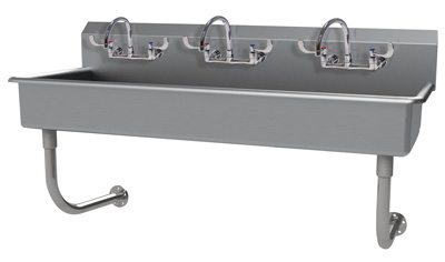 Description: Multiwash Hand Sink, splash mount faucet provision, wall mounted, includes (3) faucets, 72"W x 19-1/2"D x 29-1/2"H (overall), 16" front-to-back x 8" deep (bowl size), 8-1/2"H backsplash, punched with (4) sets of faucet holes 8" OC, includes 3-1/2" rear basket drain, 14 gauge 304 stainless steel construction, tubular stainless steel wall supports, NSF