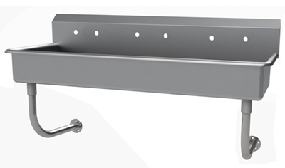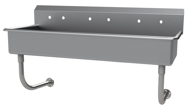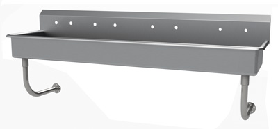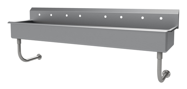 Description: Multiwash Hand Sink, splash mount faucet provision, wall mounted, 80"W x 19-1/2"D x 25-1/2"H (overall), 16" front-to-back x 5" deep (bowl size), 8-1/2"H backsplash, punched with (4) sets of faucet holes 8" OC, includes 3-1/2" rear basket drain, 14 gauge 304 stainless steel construction, tubular stainless steel wall supports, NSF, ADA compliant