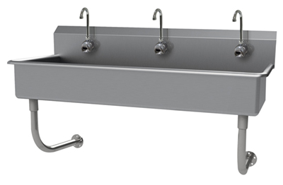 Description: Multiwash Hand Sink, splash mount faucet provision, wall mounted, (3) person, with (3) electronic faucets, 72"W x 19-1/2D x 25-1/2"H (overall), 16" front-to-back x 5" deep (bowl size), 8-1/2"H backsplash, punched with (3) single faucet holes, includes 3-1/2" rear basket drain, 14 gauge 304 stainless steel construction, tubular stainless steel wall supports, NSF, ADA compliant