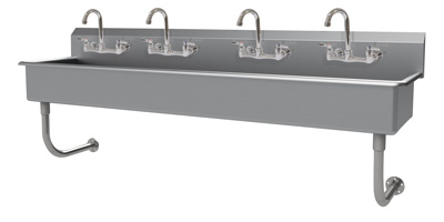 Description: Multiwash Hand Sink, splash mount faucet provision, wall mounted, includes (4) faucets with wrist blades, 80"W x 19-1/2"D x 25-1/2"H (overall), 16" front-to-back x 5" deep (bowl size), 8-1/2"H backsplash, punched with (4) sets of faucet holes 8" OC, includes 3-1/2" rear basket drain, 14 gauge 304 stainless steel construction, tubular stainless steel wall supports, NSF, ADA compliant