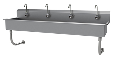 Description: Multiwash Hand Sink, splash mount faucet provision, wall mounted, includes (4) faucets with wrist blades, 96"W x 19-1/2"D x 25-1/2"H (overall), 16" front-to-back x 5" deep (bowl size), 8-1/2"H backsplash, punched with (4) sets of faucet holes 8" OC, includes 3-1/2" rear basket drain, 14 gauge 304 stainless steel construction, tubular stainless steel wall supports, NSF, ADA compliant