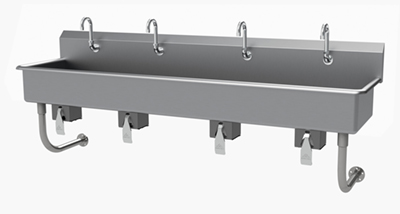 Description: Multiwash Hand Sink, splash mount faucet provision, wall mounted, with (4) electronic faucets, 80"W x 19-1/2"D x 29-1/2"H (overall), 16" front-to-back x 8" deep (bowl size), 8-1/2"H backsplash, punched with (4) single faucet holes, includes 3-1/2" rear basket drain, 14 gauge 304 stainless steel construction, tubular stainless steel wall supports, NSF