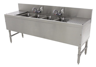 Description: Prestige Underbar Sink Unit, 4-compartment, 48"W x 20"D x 36"H, 14" front-to-back x 10" left-to-right x 10" deep sink bowls, no drainboards, 7"H backsplash, stainless steel open frame base, side crossrails, stainless steel construction, includes: (2) splash mount faucets with 6" swing spouts, NSF