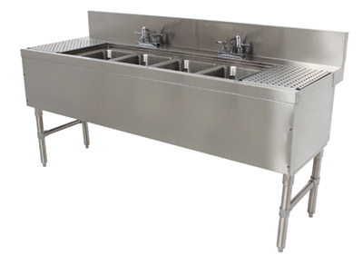 Description: Prestige Underbar Sink Unit, 4-compartment, 72"W x 25"D x 36"H, 14" front-to-back x 10" left-to-right x 10" deep sink bowls, 12" drainboards on left & right, 7"H backsplash, stainless steel open frame base, side crossrails, stainless steel construction, includes: (2) deck mount faucets with 6" swing spouts, NSF