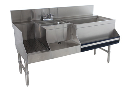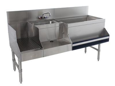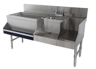 Description: Prestige Uni-Serv Speed Bar, 60"W x 30"D x 36"H (overall), 7" backsplash, 30"W x 11"D x 11" deep insulated ice bin on left, 89 lb ice capacity, dump sink with 3-1/2" basket drain, 4" splash mount faucet with swing spout, recessed drainboard with removable perforated top for glasses, blender station with recess outlet, 30" speed rail, 1-3/4" return with soda gun knock-out, stainless steel construction, stainless steel legs with adjustable plastic bullet feet, NSF