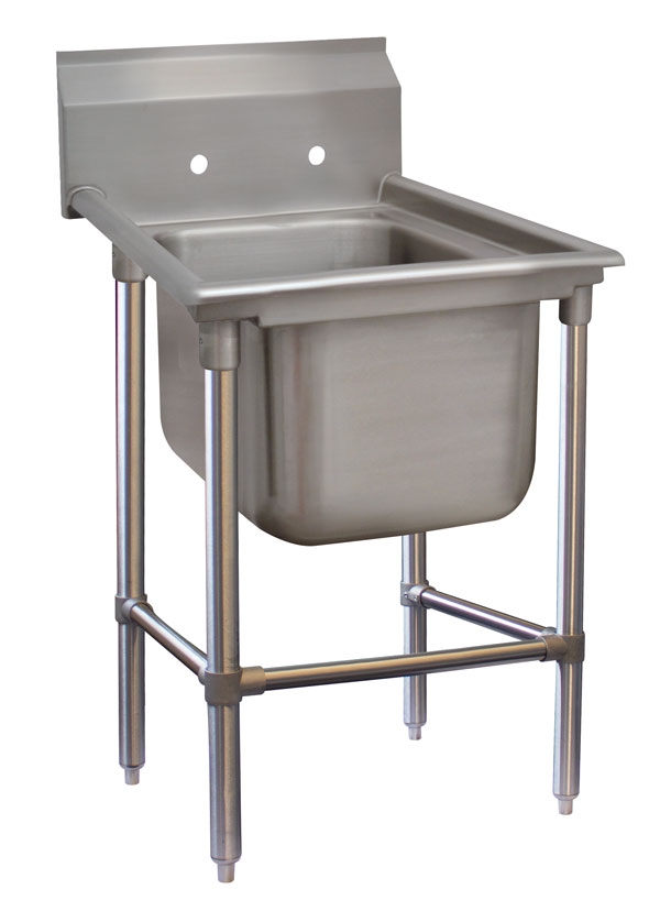 | Full Description: Square Corner Scullery Sink, 1-compartment, 24"W x 21"D front to-back x 14" deep sink compartment, 8"H backsplash, 1-1/2 IPS waste drain basket included, 16 gauge 430 stainless steel, galvanized legs with plastic bullet feet, 24-1/2" F/B x 24" L/R (overall)