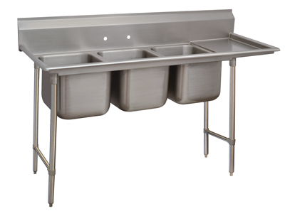 Description: Regaline Sink, 3-compartment, with right-hand drainboard, 20" front-to-back x 16"W sink compartments, 12" deep, with 8"H backsplash, stainless steel open frame base, side crossrails, 24" drainboard, 1" adjustable bullet feet, 16 gauge 304 stainless steel, overall 28" F/B x 84" L/R, NSF